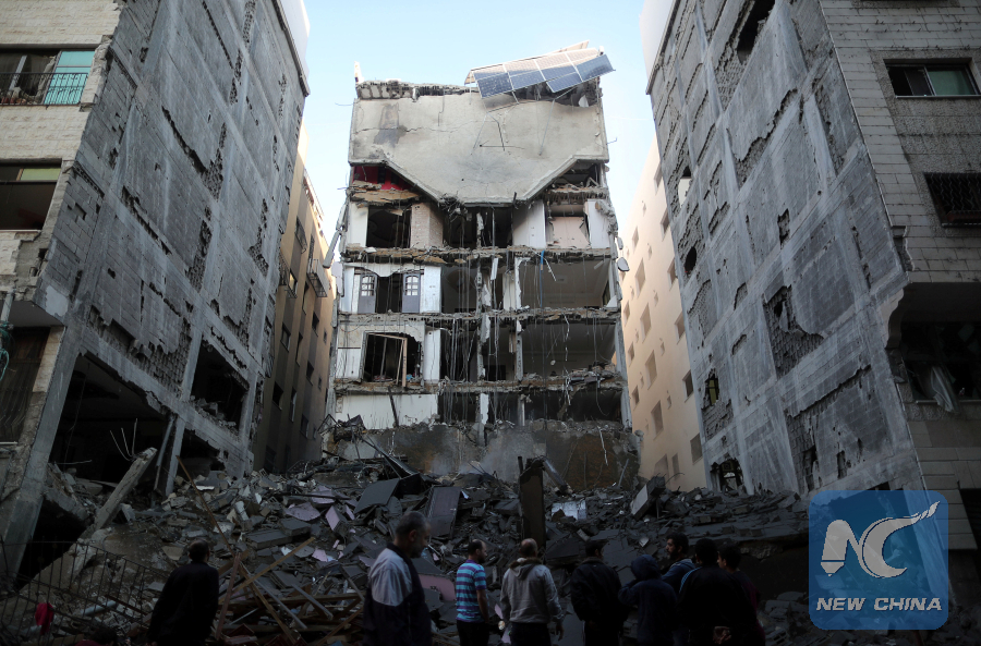 Palestinians gather near the remains of a building that was completely destroyed by an Israeli air strike, in Gaza City, on Nov. 13, 2018. (Reuters photo)