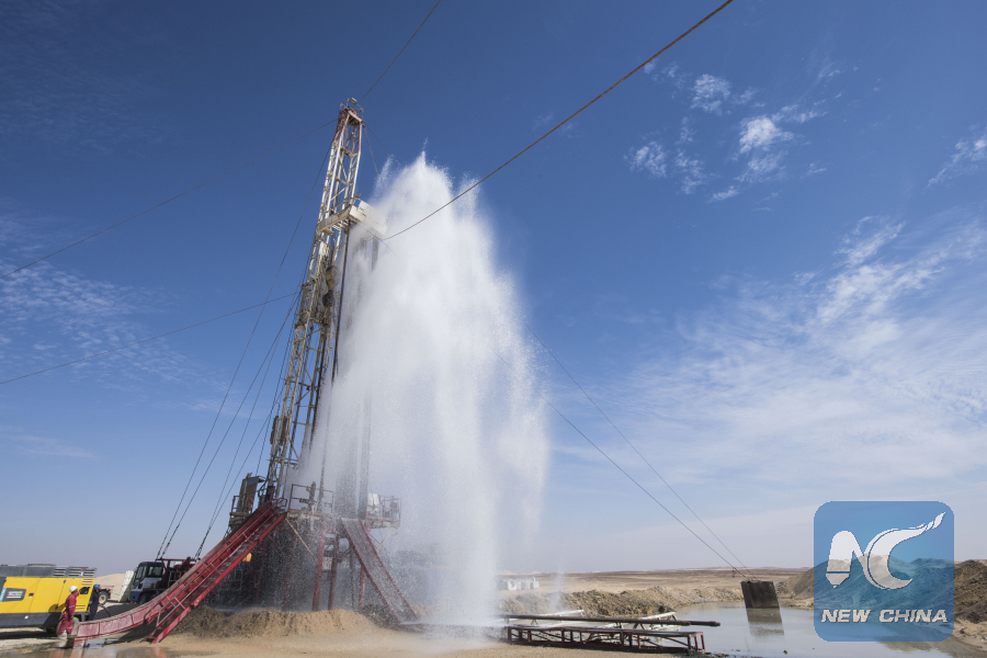 Water bursts out from the well dug by China's ZPEC drilling company in the Western Desert near Egypt's southern province of Minya, on Nov. 20, 2018. (Xinhua/Li Binian)