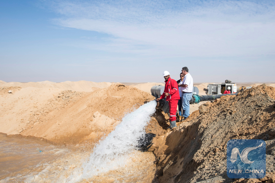 Water from the well dug by China's ZPEC drilling company massively run out of a 500-horsepower pump to cover a pool of sand in the Western Desert near Egypt's southern province of Minya, on Nov. 20, 2018. (Xinhua/Li Binian)