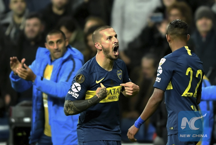 Boca Juniors' Dario Benedetto is celebrating his goal, which gives Boca the lead just before halftime in the Copa Libertadores final.