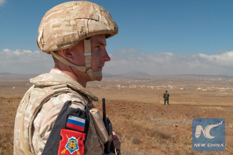 A member of the Russian military police patrols near the village of Tal Krroum in the Syrian Golan Heights on Aug. 14, 2018. (AFP Photo)