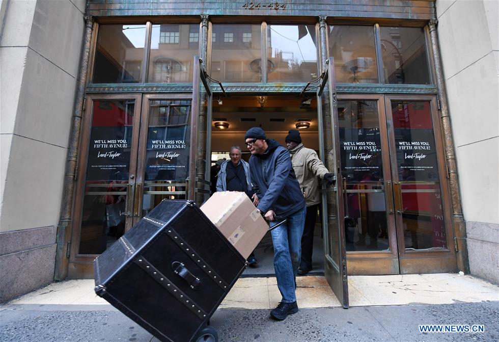 A man pushes a cart out of the flagship store of the famous department store chain Lord & Taylor on Fifth avenue in Manhattan, New York, the United States, Jan. 2, 2019. The famous department store chain Lord & Taylor officially closed its flagship store on Fifth avenue in Manhattan, New York City. (Xinhua/Li Rui)