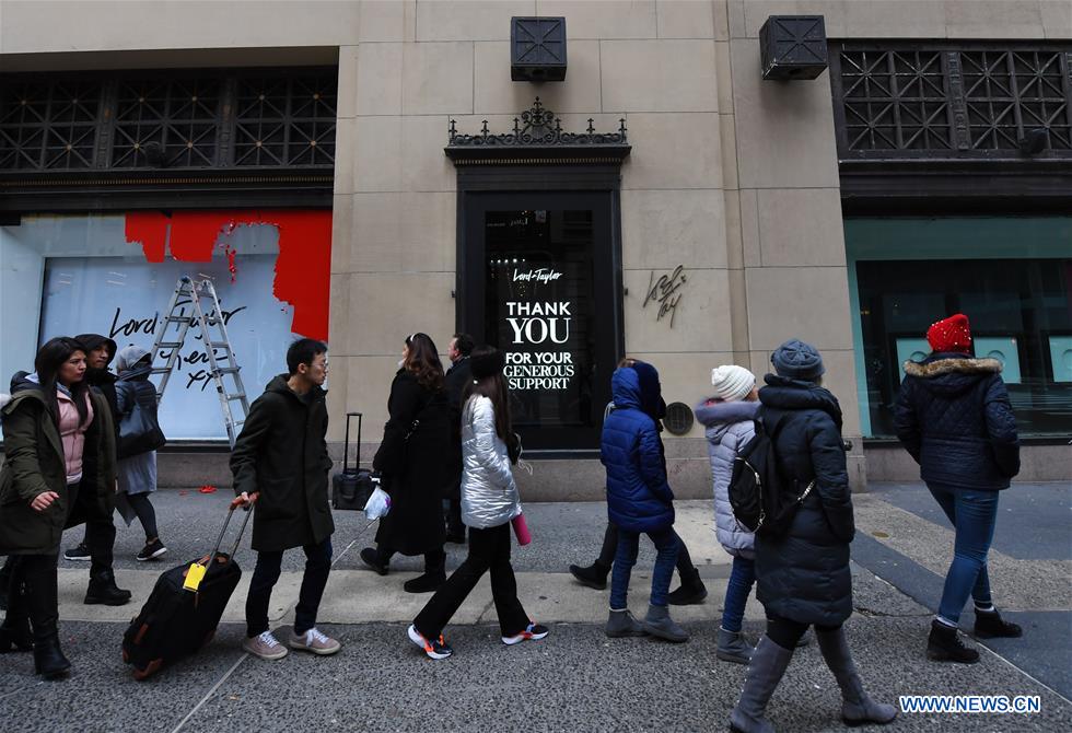 People walk past the shop window of the flagship store of the famous department store chain Lord & Taylor on Fifth avenue in Manhattan, New York, the United States, Jan. 2, 2019. The famous department store chain Lord & Taylor officially closed its flagship store on Fifth avenue in Manhattan, New York City.