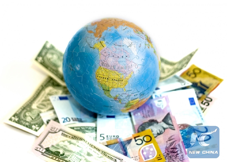 Undated photo shows a globe standing on stacks of banknotes. (Xinhua photo)