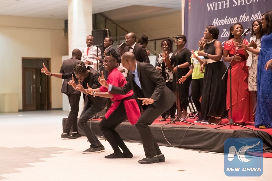 Zambian students under Chinese Government Scholarship programme perform a dance during a ceremony at the National Museum in Lusaka, Zambia, Aug. 25, 2017. The Chinese Embassy in Zambia held a grand ceremony to welcome back as well as bid farewell to students who have received scholarships to study in China. (Xinhua/Peng Lijun)