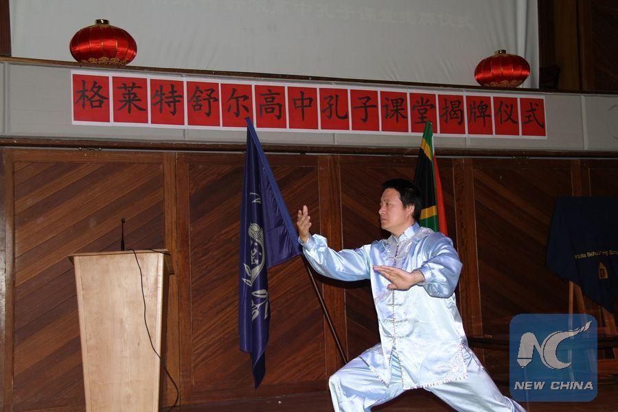File photo shows a Chinese teacher practices Taichi, an internal martial art, during the launch of Confucius Classroom in Cape Town, South Africa, March 24, 2017. (Xinhua/Gao Yuan)