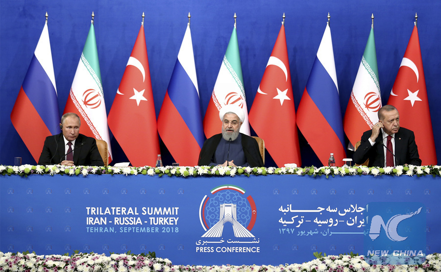 Russia's President Vladimir Putin (L), Iran's President Hassan Rouhani (C) and Turkey's President Recep Tayyip Erdogan attend a joint press conference in Tehran, Iran, Sept. 7, 2018. (AP)
