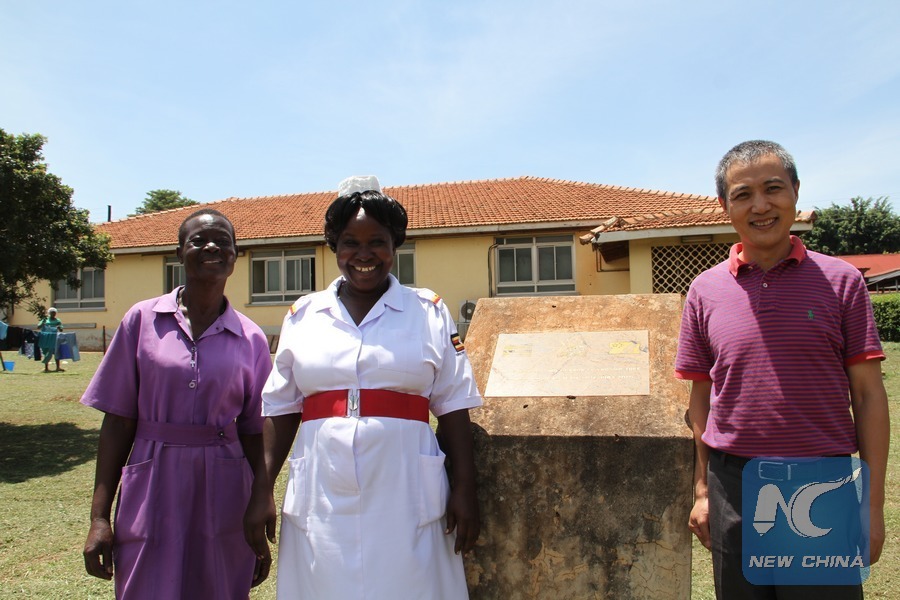 Cong Linhai (R), head of 18th Chinese medical team and nurse Rose Kawuma(L) and Jesca Namugoya pose for a group photo next to the monument of the Sino-Ugandan Friendship Tree at Jinja Regional Referral Hospital in eastern Uganda, Aug. 14, 2018. In the lush green compound of Jinja Regional Referral Hospital in eastern Uganda, a tree blossoms. It is no ordinary tree, but a tree that signifies the 29-year relation between Chinese medical teams and the hospital. TO GO WITH Feature: Ugandan nurses adopt traditional Chinese acupuncture therapy. (Xinhua/Zhang Gaiping)