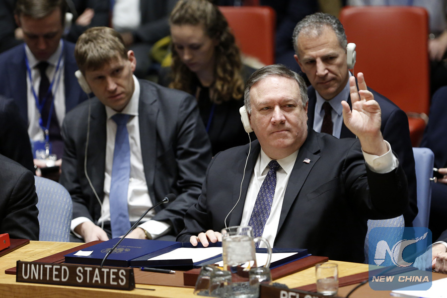 U.S. Secretary of State Mike Pompeo gestures to speak during a United Nations Security Council emergency meeting on the situation in Venezuela, at the UN headquarters in New York, Jan. 26, 2019. (Xinhua/Li Muzi)