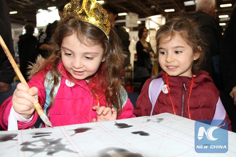 A little girl tries Chinese calligraphy at the Chinese exhibition area of the 2019 Paris book fair in Paris, capital of France, on March 15, 2019. (Xinhua/Yang Yimiao)