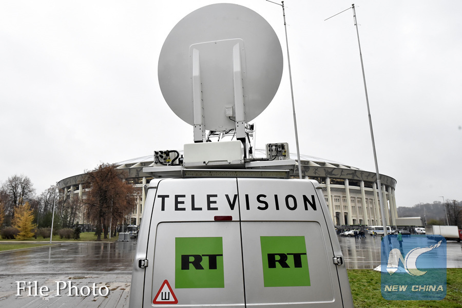 A Russia's state-owned RT television broadcast van is seen parked outside the Luzhniki stadium ahead of an international friendly football match between Russia and Argentina in Moscow on November 11, 2017. (AFP PHOTO)
