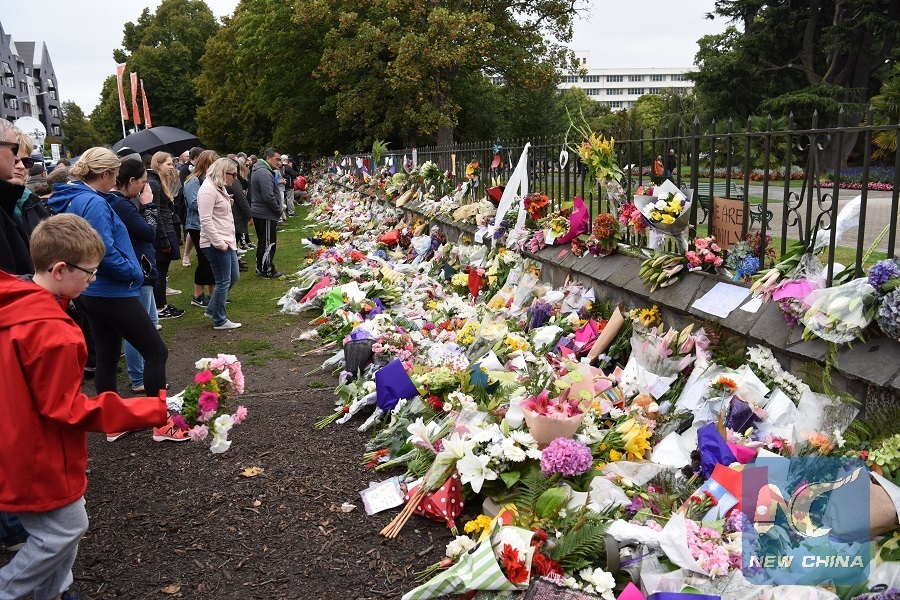 Flowers are placed by people to mourn the victims of the attacks on two mosques in Christchurch, New Zealand, on March 17, 2019. (Xinhua/Guo Lei)