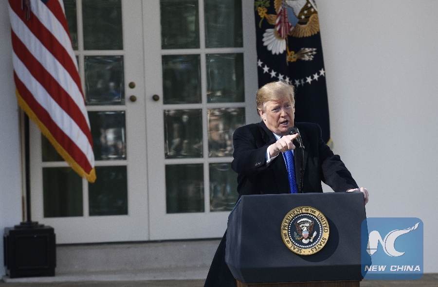 U.S. President Donald Trump speaks at the Rose Garden in the White House in Washington D.C., the United States, on Feb. 15, 2019. Trump announced Friday he will sign a national emergency to expand the U.S.-Mexico border wall and push for his signature campaign promise. (Xinhua/Hu Yousong)