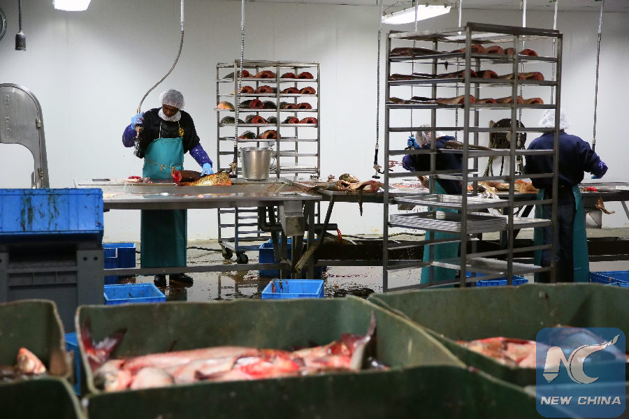 Staff members with Two Rivers Fisheries do processing work at their plant in Wickliffe, the U.S. state of Kentucky, on Oct. 30, 2017. (Xinhua/Liu Yifang)