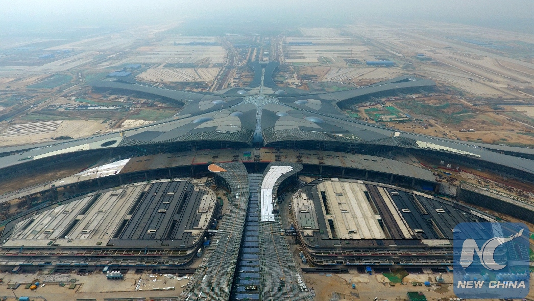 Aerial photo taken on April 28, 2018 shows staff members working on an overpass in front of the terminal of a new airport under construction in Beijing, capital of China. (Xinhua/Zhang Chenlin)
