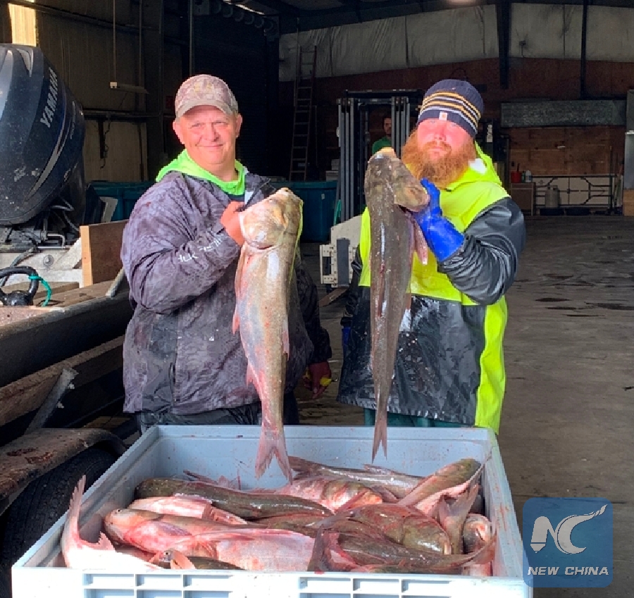 Fishermen display Asian carp caught in the water near a fish collection site of Angie Yu, president of the Two Rivers Fisheries in Wickliffe, Ballard County in southeastern U.S. state of Kentucky on April 12, 2019. (Xinhua/Xu Feng)