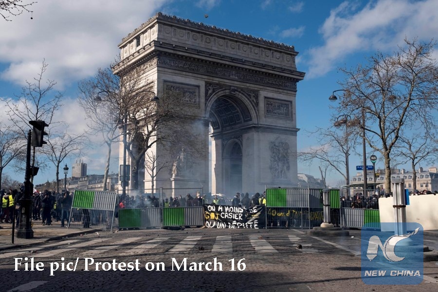Yellow Vest protestors demonstrated on Champs Elysees avenue. Clashes erupted with police. Several shops and restaurants have been vandalized or set on fire in Paris on March 16, 2019. "Yellow Vests" stage 23rd protest on April 20, amid fears of violence. (Xinhua/Alexandre Karmen)