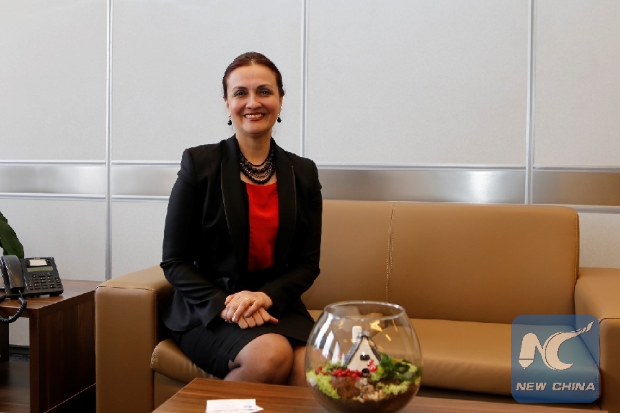 Muge Varol Ilicak, commissioner of Turkish Section of Beijing Expo 2019, attends Xinhua exclusive interview in Ankara, Turkey, on April 22, 2019. (Xinhua/Qin Yanyang)