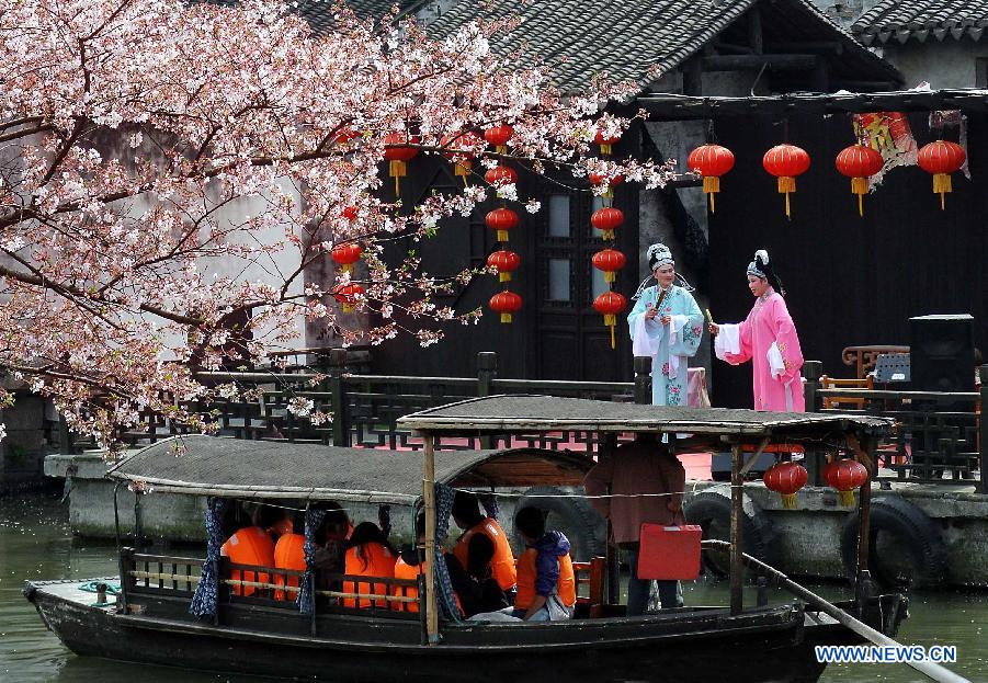 Artists perform the Yueju Opera on the stage decorated with lanterns in Xitang ancient township, east China's Zhejiang Province, March 31, 2013. China will hold the Conference on Dialogue of Asian Civilizations starting from May 15. Under the theme of "exchanges and mutual learning among Asian civilizations and a community with a shared future," the conference includes an opening ceremony and sub-forums. (Xinhua/Wang Song)