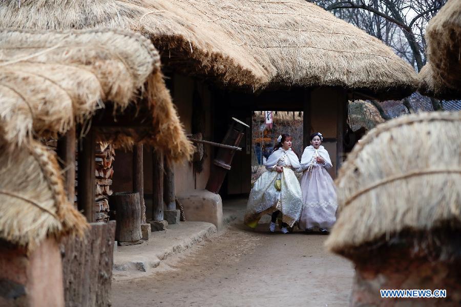 Tourists dressed in traditional costume visit a folklore-themed village in Yongin, South Korea, Feb. 5, 2019. China will hold the Conference on Dialogue of Asian Civilizations starting from May 15. Under the theme of "exchanges and mutual learning among Asian civilizations and a community with a shared future," the conference includes an opening ceremony and sub-forums. (Xinhua/Wang Jingqiang)