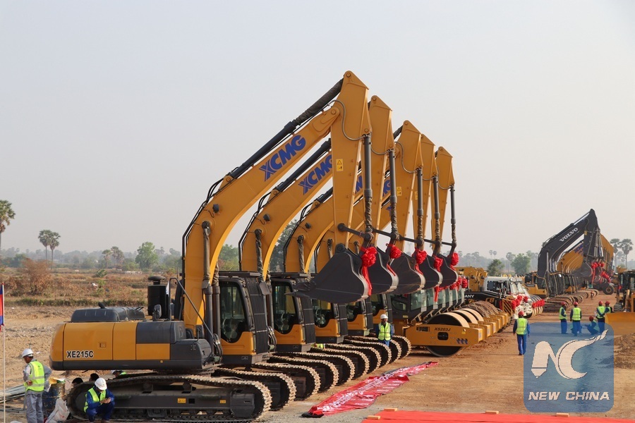 File photo shows Machines line up during a groundbreaking ceremony for the construction of a 190-km expressway stretching from capital Phnom Penh to the deep-sea port province of Preah Sihanouk in Kampong Speu, Cambodia, March 22, 2019. (Xinhua)