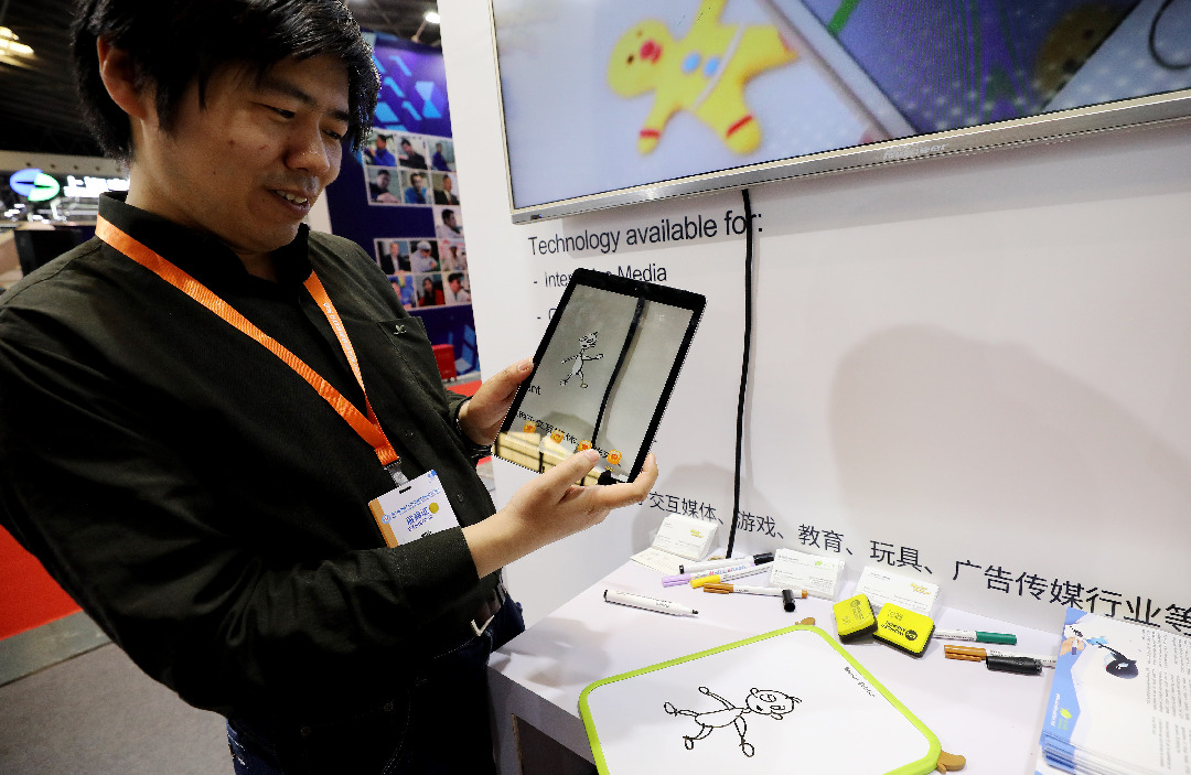 A staff member shows a software that can transform 2D still drawings into animated images at the seventh China (Shanghai) International Technology Fair in east China's Shanghai, April 18, 2019. (Xinhua)