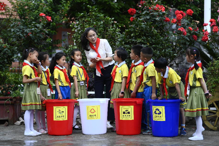 Pupils learn garbage sorting knowledge from a teacher at a primary school in Taijiang County, southwest China's Guizhou Province, June 5, 2019. Various activities were held across the country to raise people's awareness of garbage sorting and help them develop the habit of waste classification. (Xinhua)