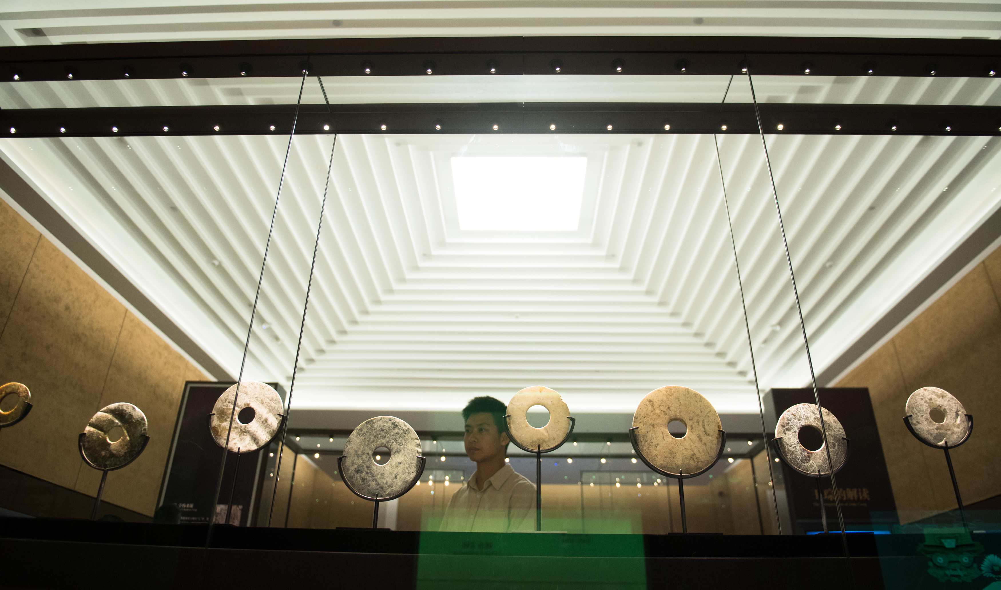 A man looks at jade artifacts excavated from Liangzhu relic site in Hangzhou. (Xinhua/Weng Xinyang)