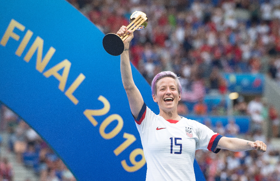 Megan Rapinoe of the United States celebrates with the Golden Ball trophy during the awarding ceremony of the 2019 FIFA Women's World Cup at Stade de Lyon in Lyon, France, July 7, 2019. (Xinhua/Xiao Yijiu)
