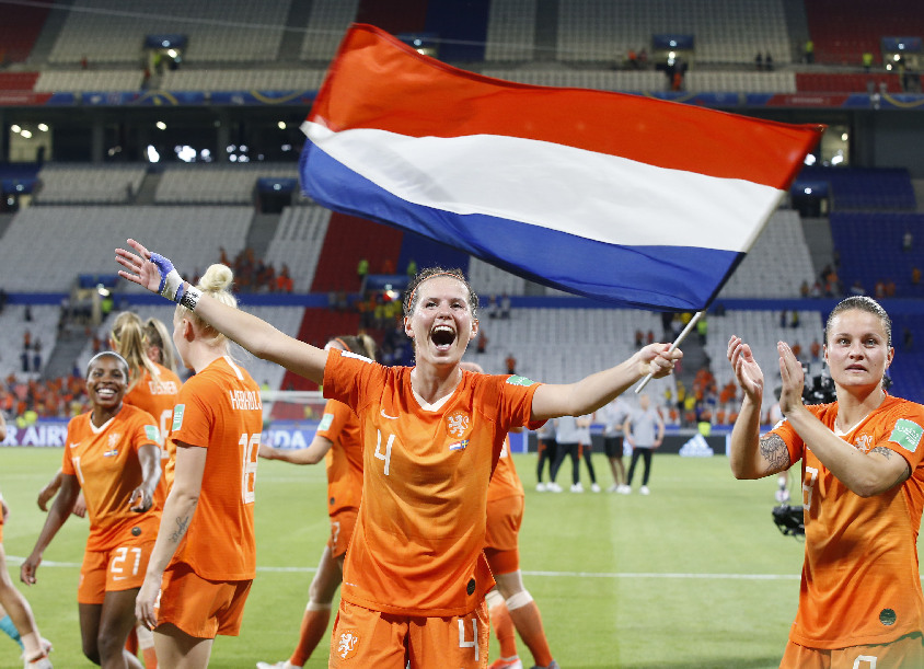 Merel Van Dongen (front) of the Netherlands celebrates after the semifinal match between the Netherlands and Sweden at the 2019 FIFA Women's World Cup at Stade de Lyon in Lyon, France, July 3, 2019. (Xinhua/Ding Xu)
