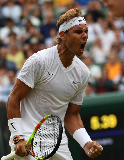 Rafael Nadal celebrates during the men's singles quarterfinal match against Sam Querrey of the United States at the 2019 Wimbledon Tennis Championships in London, Britain, on July 10, 2019. (Xinhua/Lu Yang)