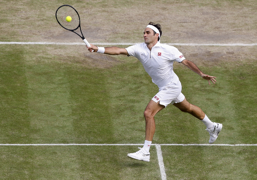 Roger Federer competes during the men's singles quarterfinal match against Kei Nishikori of Japan at the 2019 Wimbledon Tennis Championships in London, Britain, on July 10, 2019. (Xinhua/Han Yan)