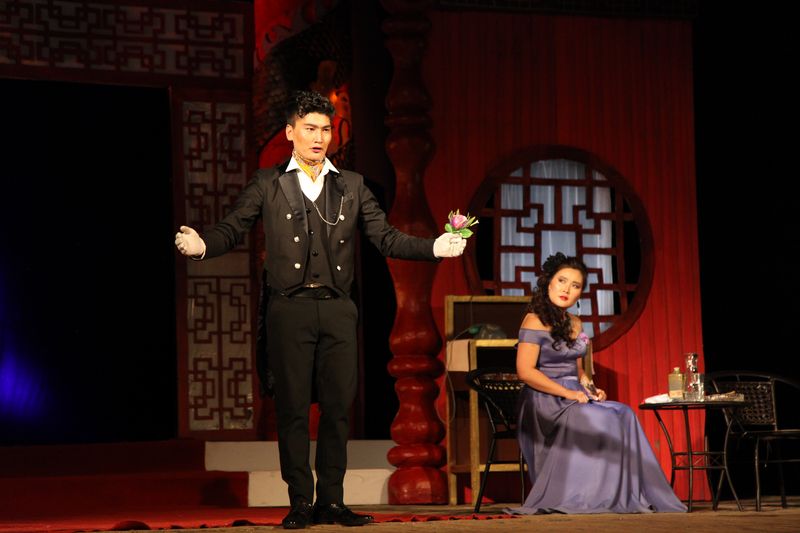 Actors perform during the debut of the Mongolian version of Chinese drama "Sunrise" at the State Academic Drama Theater of Mongolia in Ulan Bator, capital of Mongolia, April 27, 2019. (Xinhua/Suriya)