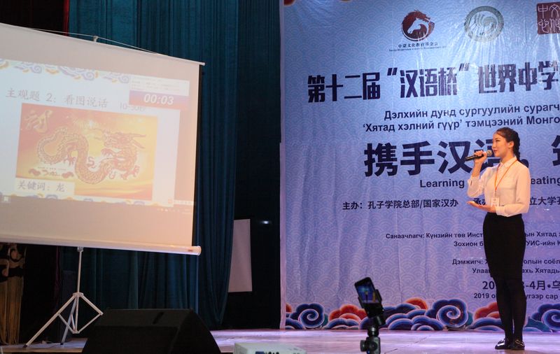 Contestant Chantsal Nomin-Erdene takes part in the final round of the "Chinese Bridge" competition held in Ulan Bator, capital of Mongolia, April 13, 2019. (Xinhua/Suriya)