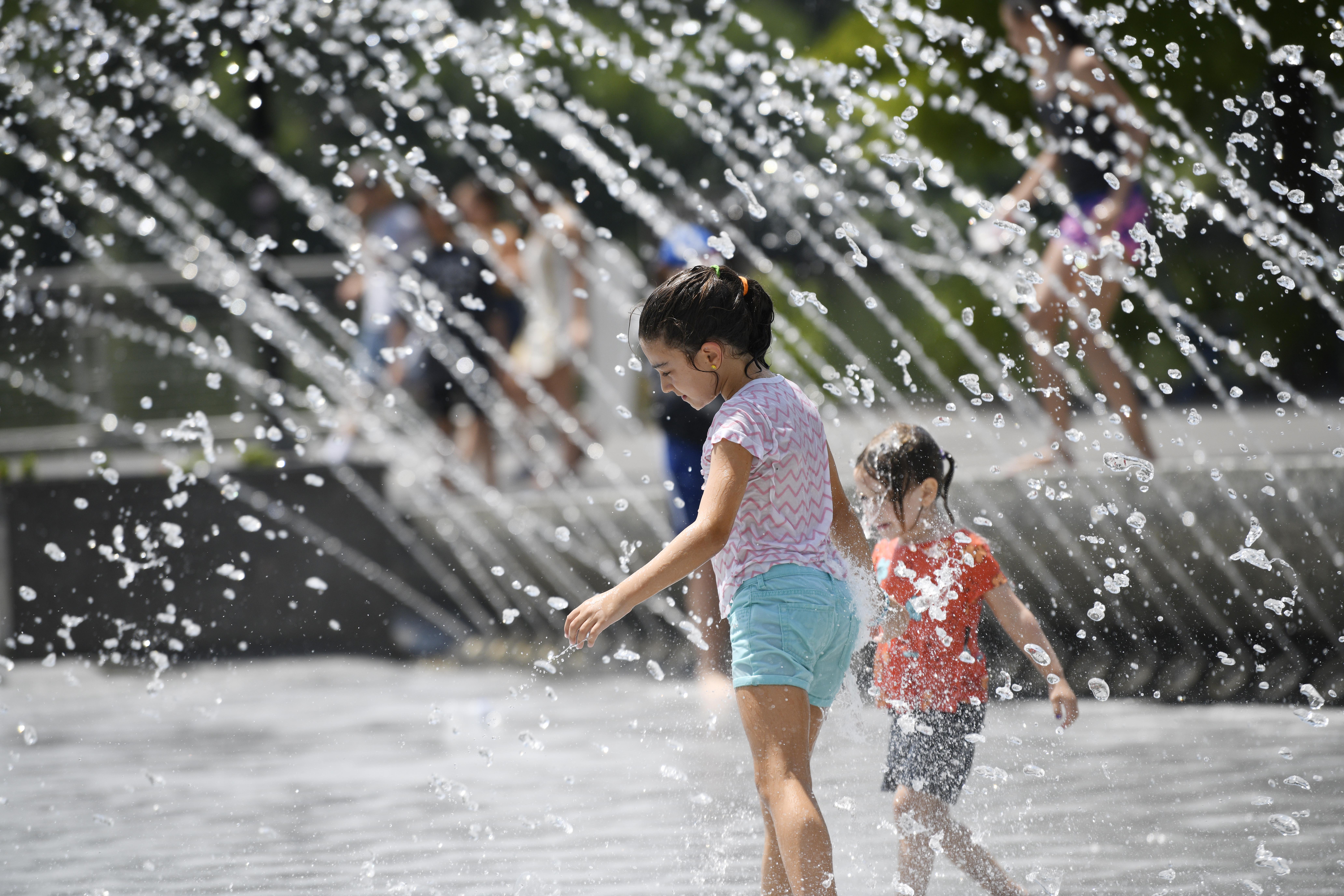 People cool off at a fountain in New York City, the United States, July 20, 2019. (Xinhua/Li Muzi)