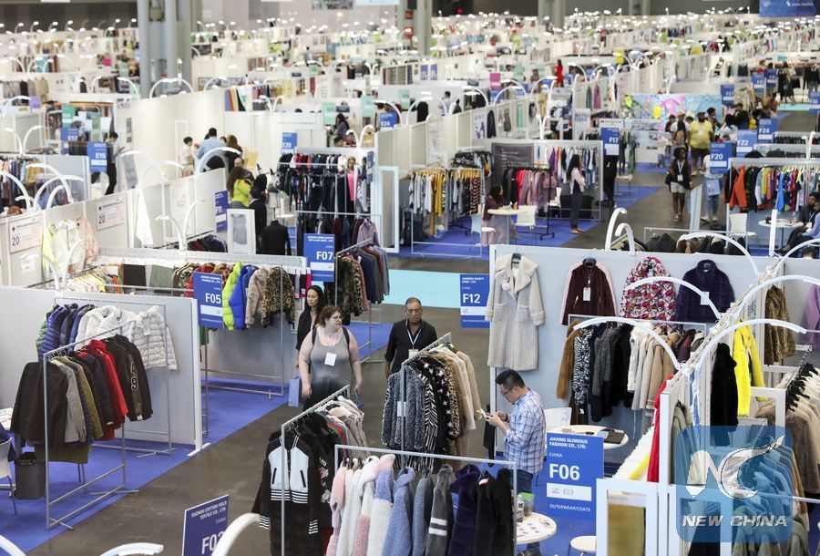 People visit the 20th China Textile and Apparel Trade Show in New York, the United States, July 22, 2019. The 20th China Textile and Apparel Trade Show in New York opened on Monday in Manhattan's Javits Center, serving as a platform to showcase the latest industrial trends and help Chinese companies explore the U.S. market. Over 500 Chinese garment, fabric and textile companies are attending this year's trade show, which will run through Wednesday. Another 300 or so companies from 16 countries and regions also joined the show with an exhibition area of 30,000 square meters. (Xinhua/Wang Ying)