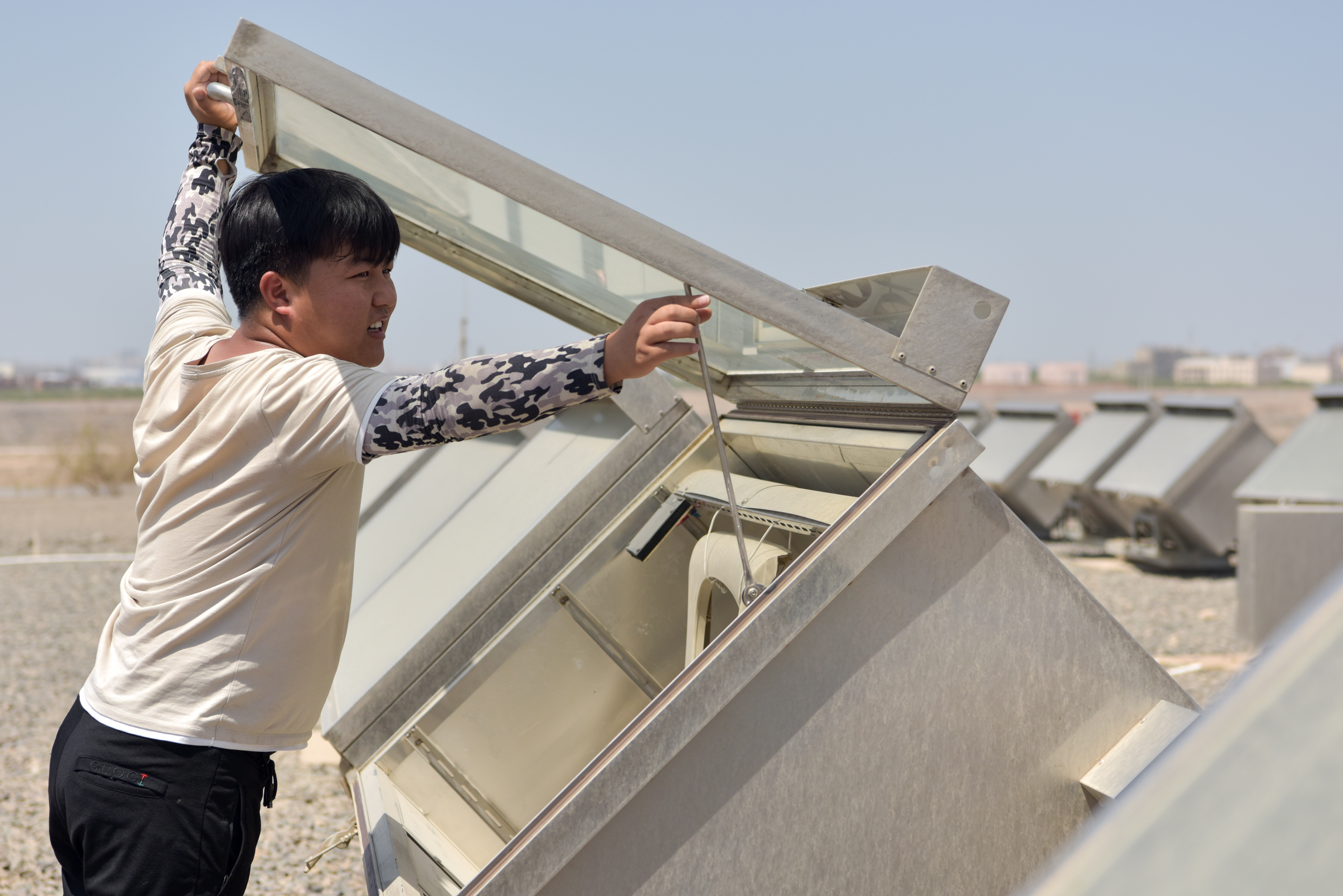 Inspector You Liwu adjusts the angle of photovoltaic panel at a photovoltaic dry-heat test area on a large patch of land of the Xinjiang Turpan Natural Environment Experimental Research Center in Turpan, northwest China's Xinjiang Uygur Autonomous Region, July 17, 2019. (Xinhua/Ding Lei)