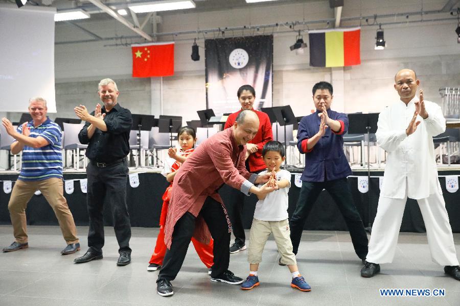 Participants practice Chinese martial arts during the "EU-China Youth Music & Art Festival 2019" held in Zandhoven, a small town in north Belgium, July 27, 2019. The "EU-China Youth Music & Art Festival 2019" opened on Saturday night in Zandhoven. Young people and folk artists from Belgium and China gathered for musical performances. (Xinhua/Pan Geping)