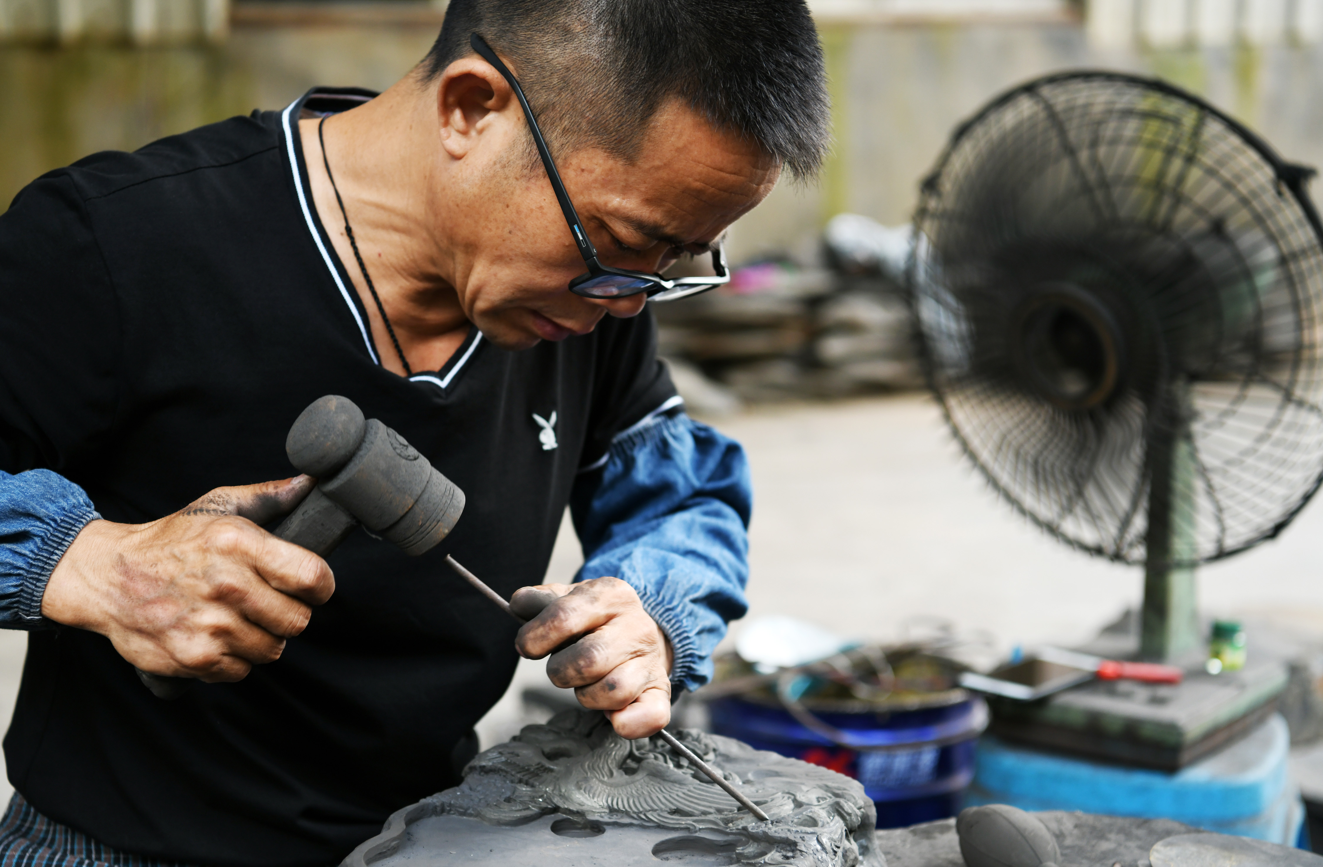Zhou processes a Sizhou inkstone carving in Cengong County, SW China's Guizhou Province, July 30, 2019. (Xinhua/Yang Wenbin)