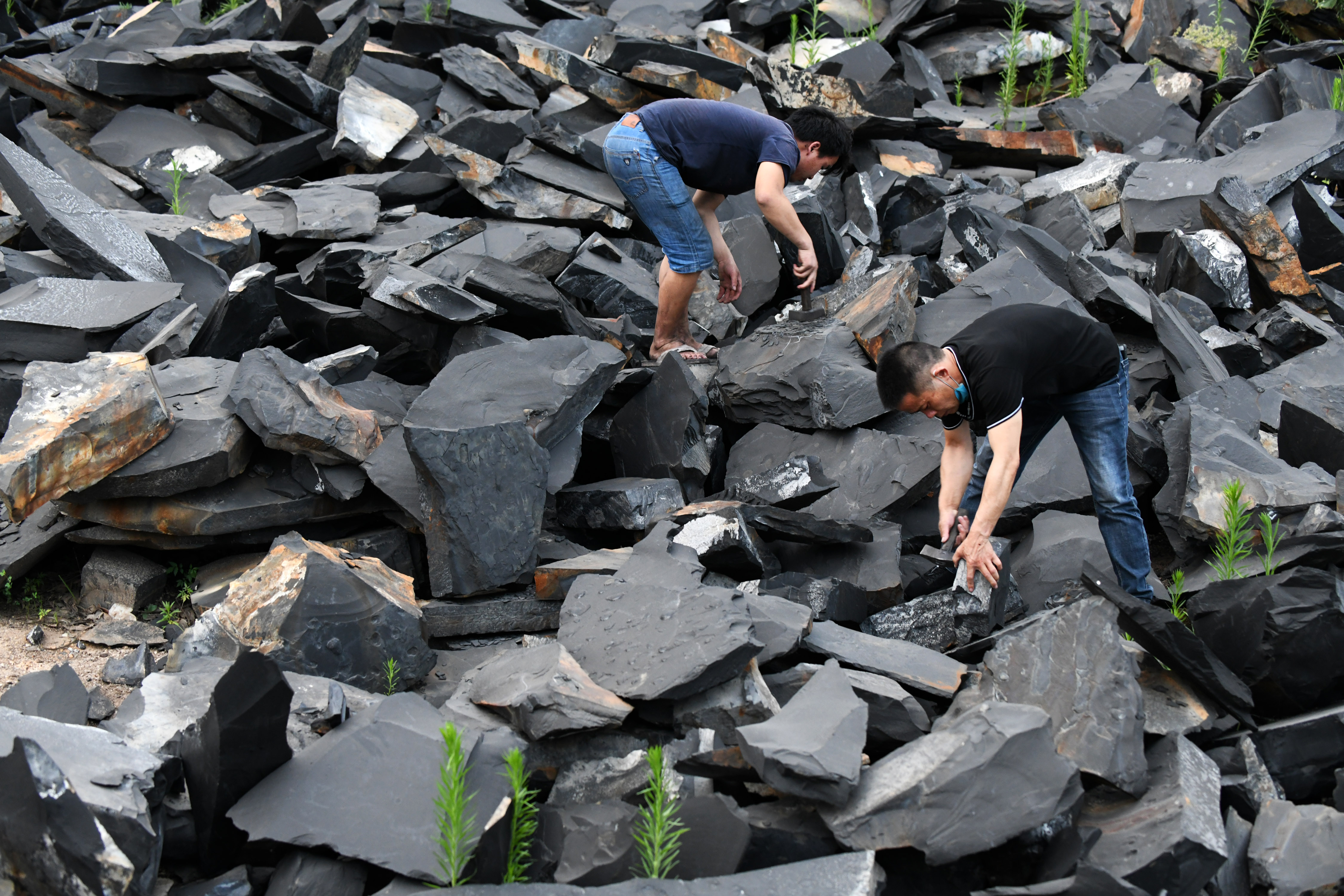 Zhou and his apprentice select stones to make the Sizhou inkstone in Cengong County, SW China's Guizhou Province, July 30, 2019. (Xinhua/Yang Wenbin)