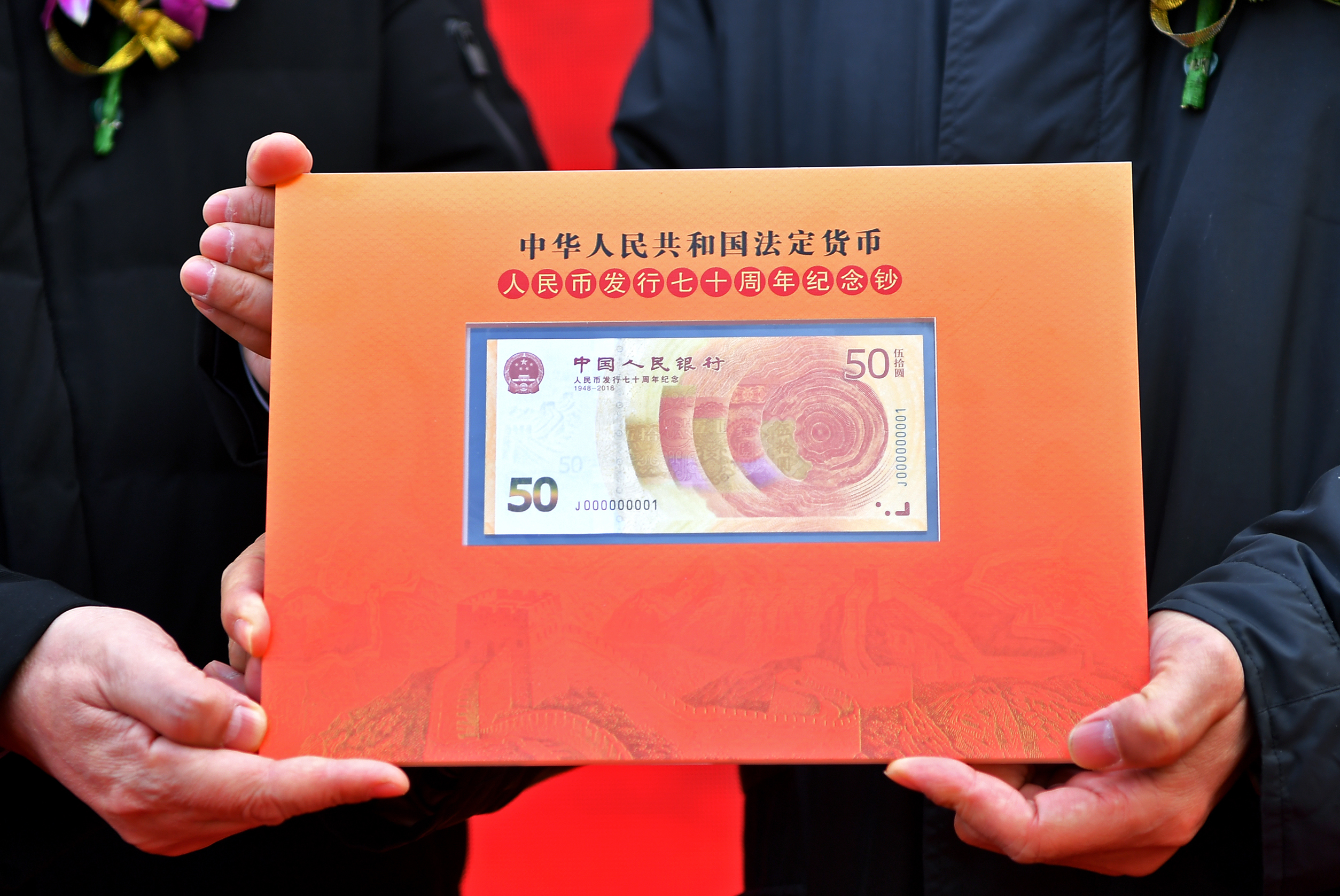 Photo taken on Dec. 28, 2018 shows the No. J000000001 commemorative banknote of the Chinese currency renminbi during a ceremony in Shijiazhuang, north China's Hebei Province. (Xinhua/Li Xin)