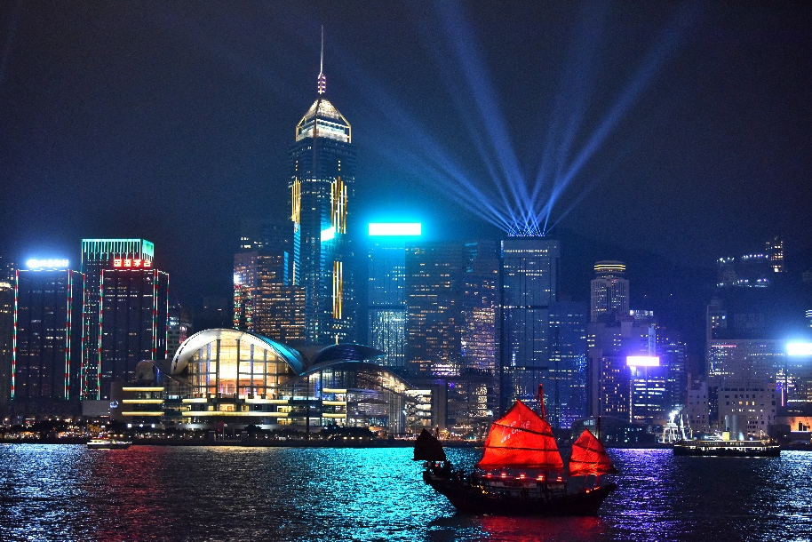 Photo taken on Dec. 1, 2017 shows nightly light show in Victoria Harbour, south China's Hong Kong, Dec. 1, 2017. (Xinhua/Wang Xi)