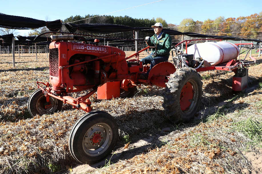 Ginseng grower Jiang Mingtao works with a tractor at a ginseng farm in Marathon County of Wisconsin state, the United States, on Oct. 22, 2018. (Xinhua/Wang Ping)
