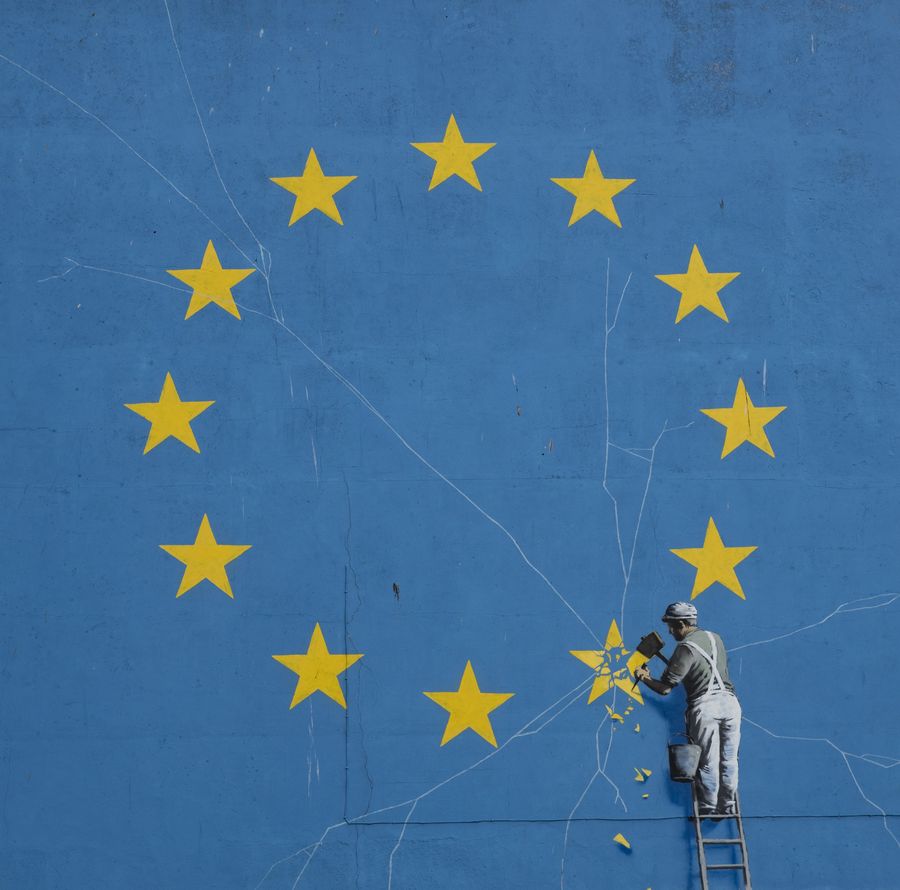 A painted mural by British graffiti artist Banksy depicts a workman chipping away at one of the stars on an EU themed flag in Dover, Britain. (Xinhua/Han Yan)