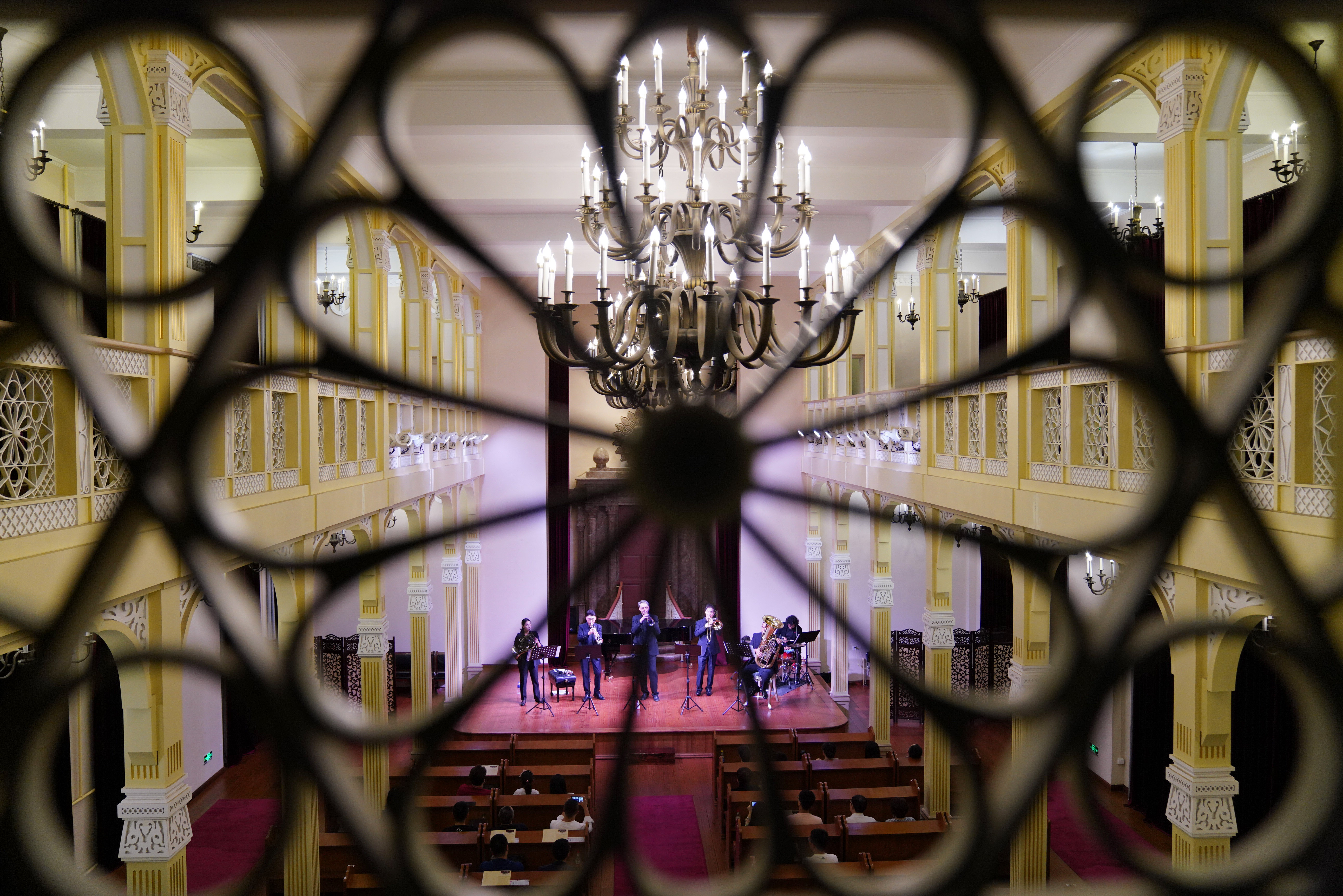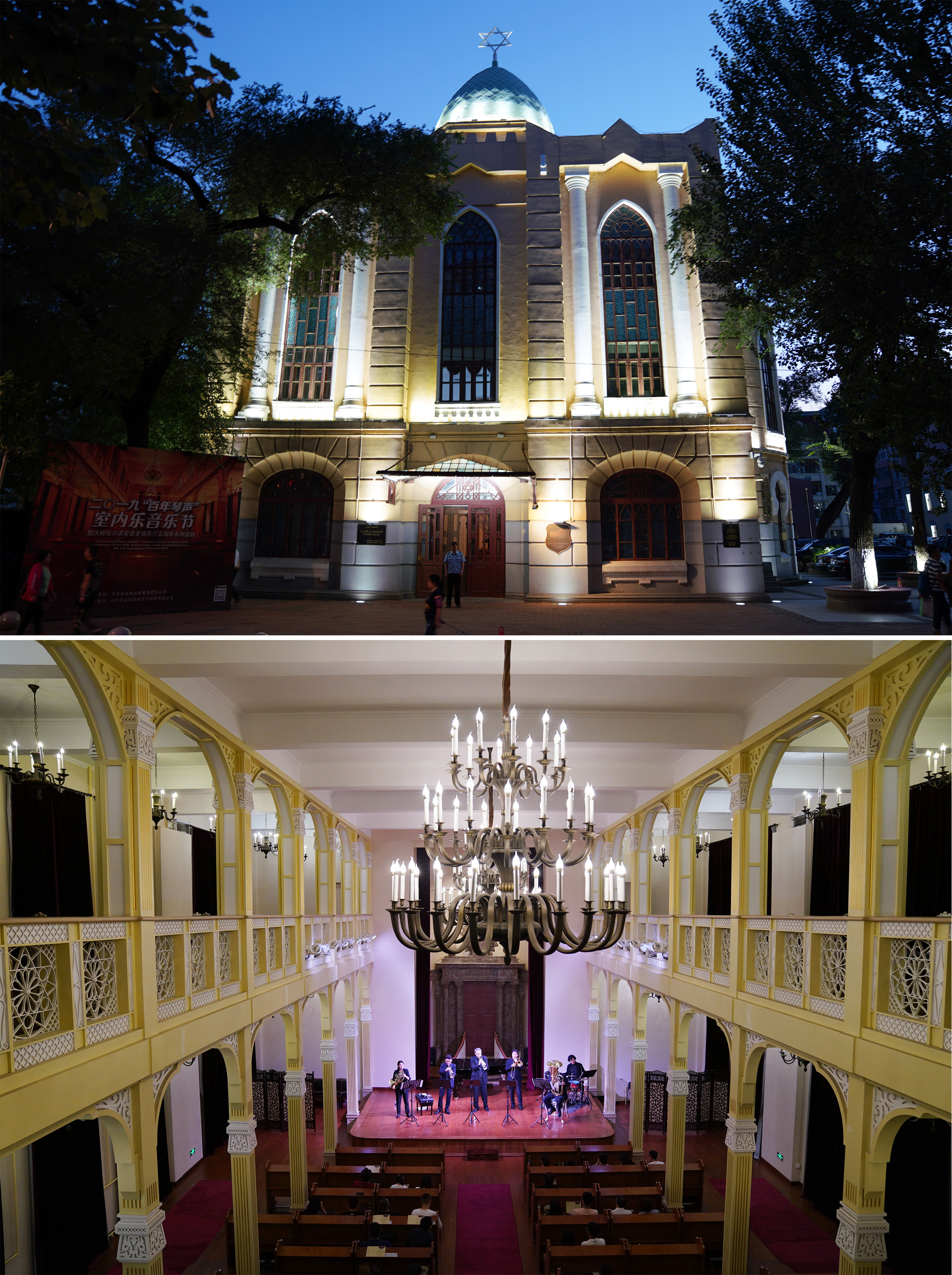 Combo photo taken on Aug. 24, 2019 shows the exterior of the Old Synagogue Concert Hall(up) and performance inside the hall(down)in Harbin, capital of northeast China's Heilongjiang Province. (Xinhua/Wang Jianwei)