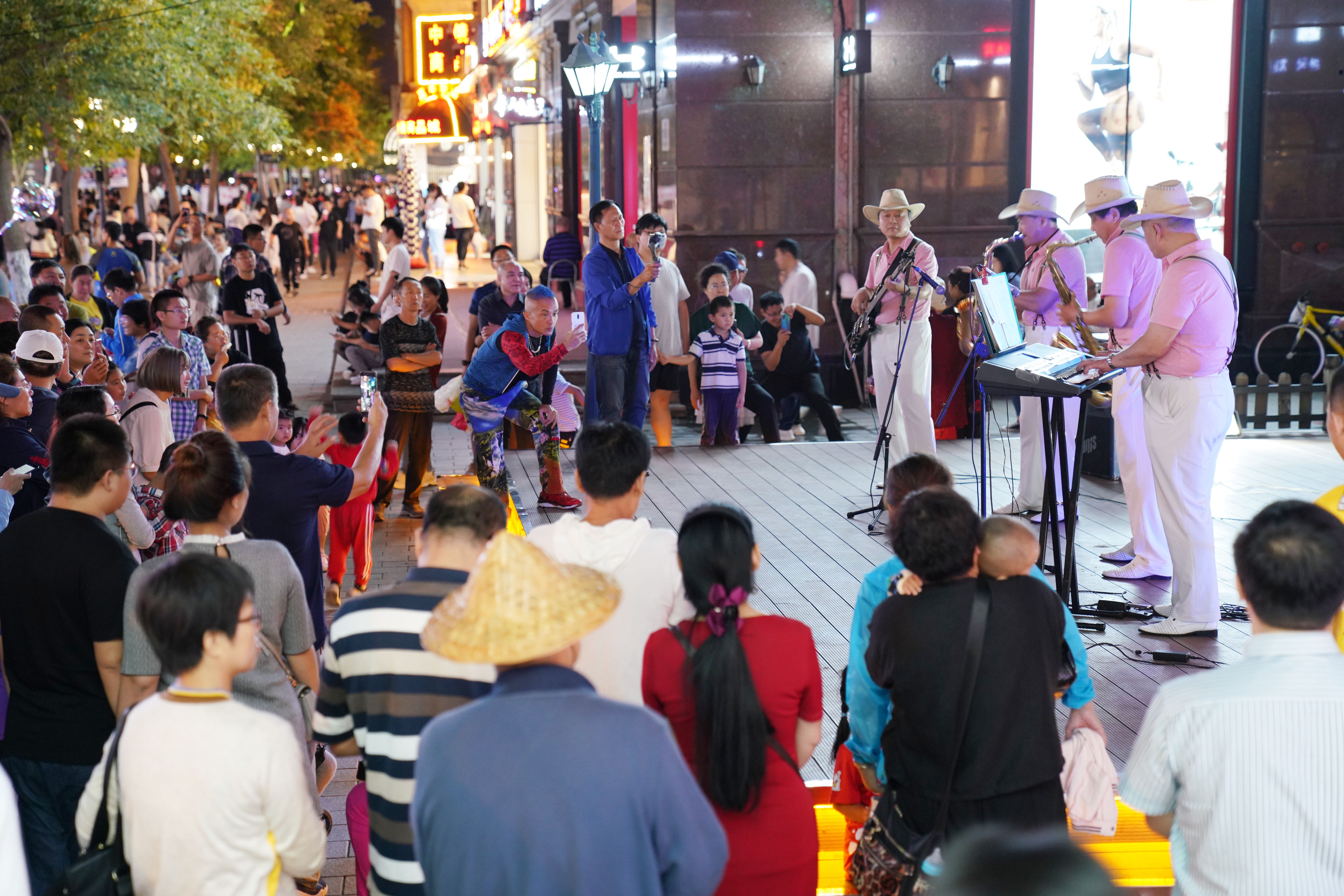 People enjoy performance on the Central Avenue in Harbin, capital of northeast China's Heilongjiang Province, Aug. 24, 2019. (Xinhua/Wang Jianwei)