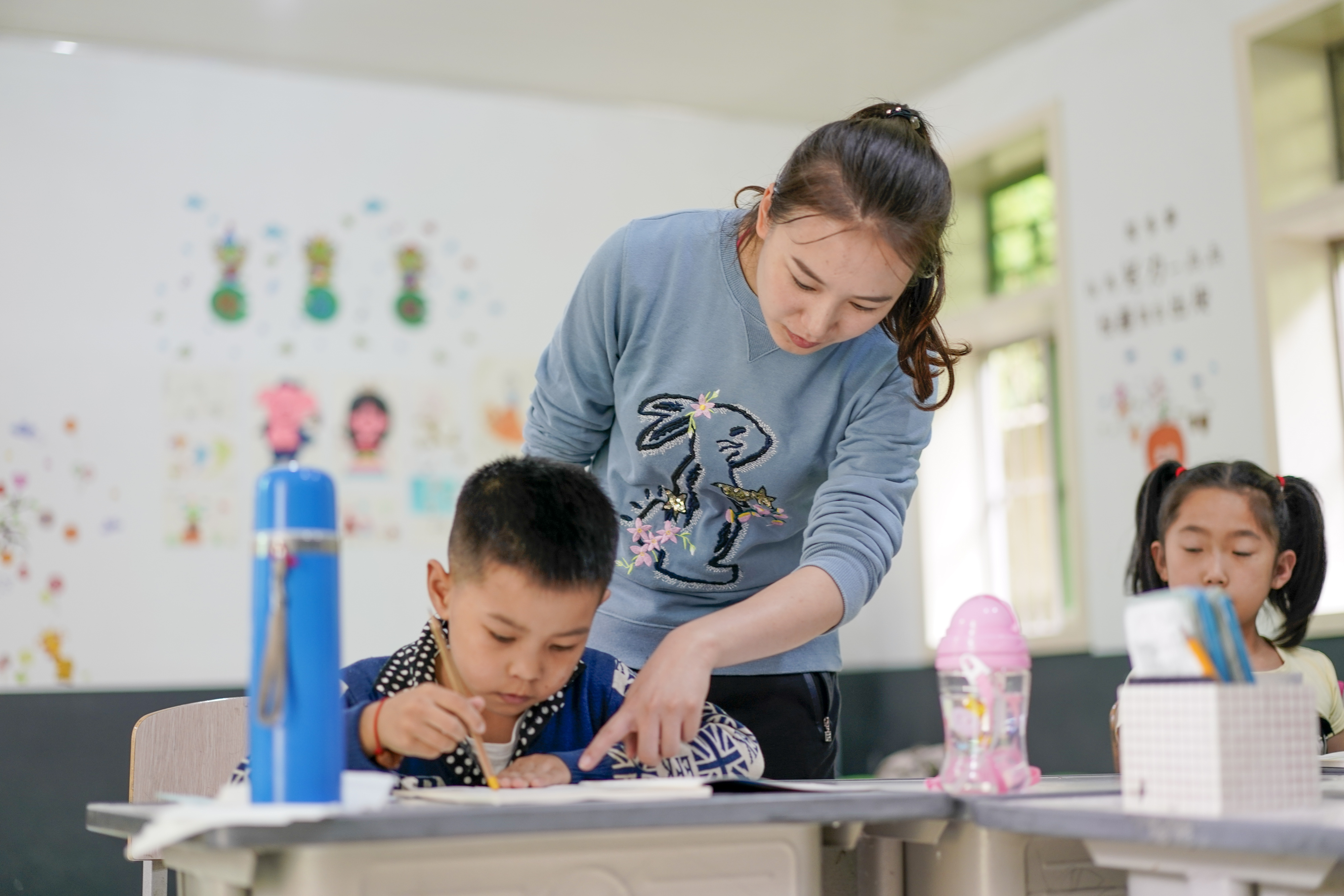 Mu Yi (C) instructs a student in schoolwork at Lianhua Primary School of Luzi Village, Chengkou County, SW China's Chongqing Municipality. (Xinhua/Liu Chan)