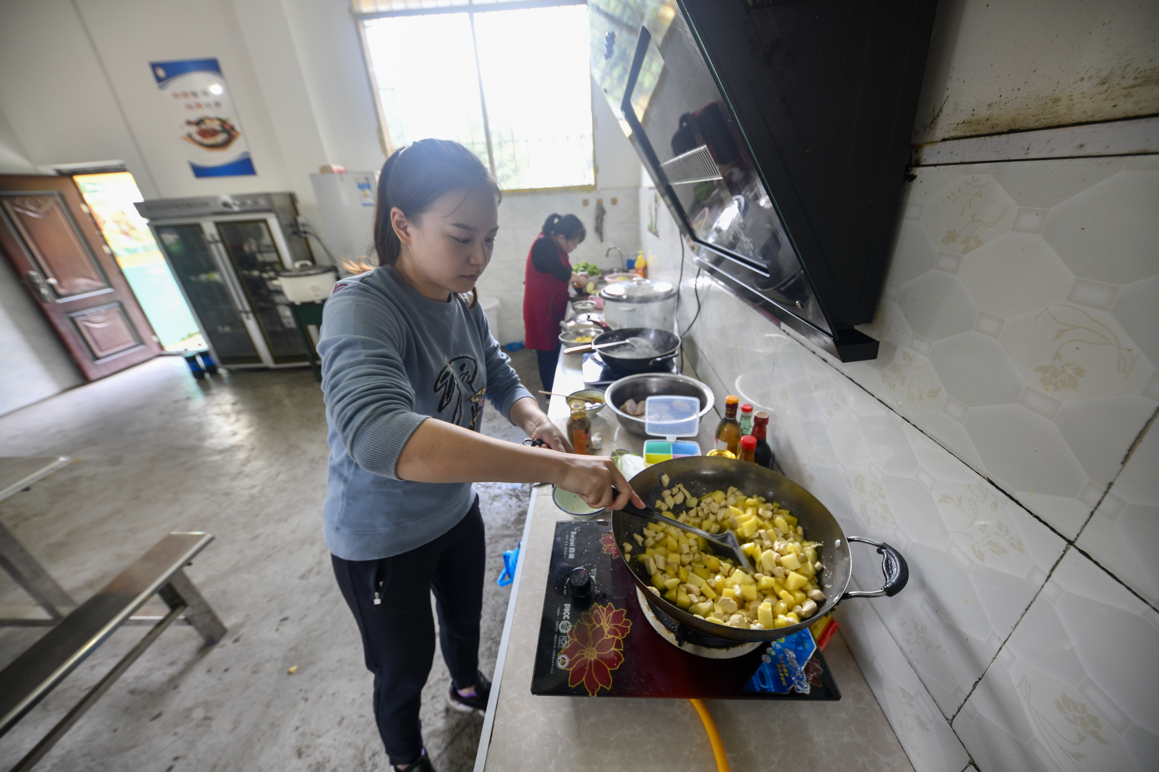 Mu Yi (front) cooks for students at the kitchen of Lianhua Primary School of Luzi Village, Chengkou County, SW China's Chongqing Municipality. (Xinhua/Liu Chan)