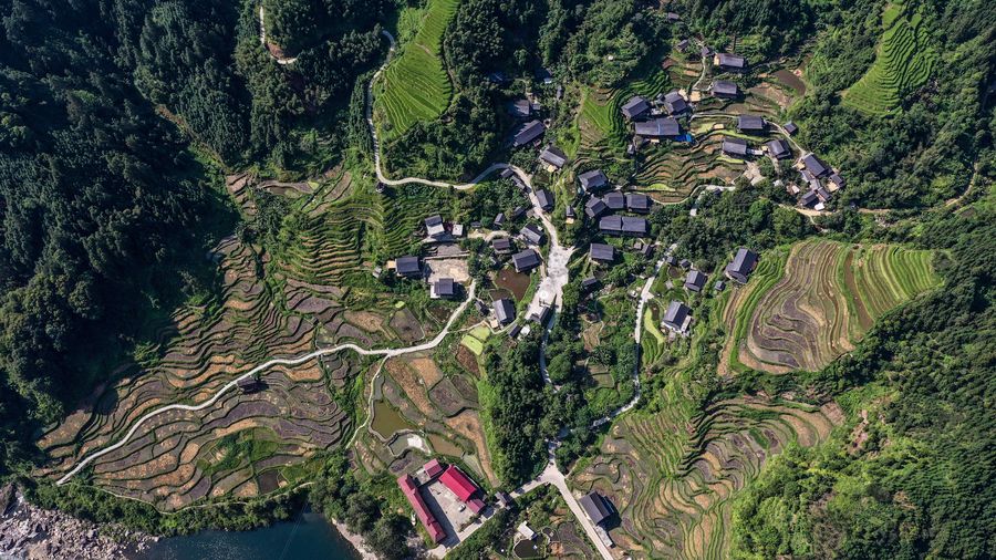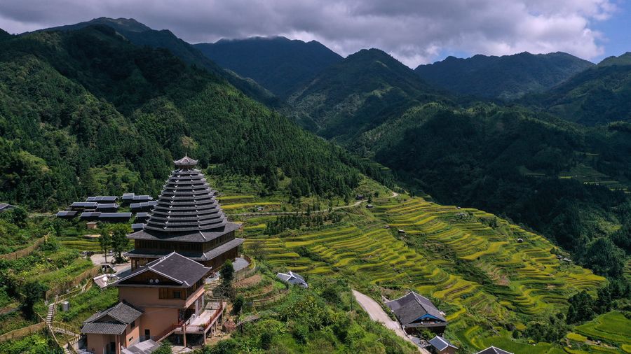 Aerial photo taken on Sept. 11, 2019 shows the autumn scenery of Tiantang Village, Xiangfen Township in Rongshui Miao Autonomous County, south China's Guangxi Zhuang Autonomous Region.(Xinhua/Zhang Ailin)