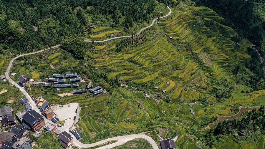 Aerial photo taken on Sept. 11, 2019 shows the autumn scenery of Sirong Township in Rongshui Miao Autonomous County, south China's Guangxi Zhuang Autonomous Region.(Xinhua/Zhang Ailin)